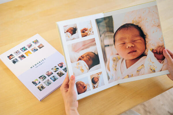 里帰り中は祖父母もふくめ、みんなバタバタ......。里帰り中に撮った写真でフォトブックをつくって贈れば、孫が生まれた喜びをじっくりかみしめるきっかけに。富士フイルムのフォトブックにはさまざまな種類があり、デザインも豊富。文字入れ機能を使えば、里帰りのお礼のメッセージも添えられます。