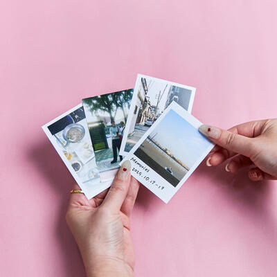 富士フイルムプリント&ギフトの「ハーフサイズプリント」がおすすめ。トレーディングカードと同じ大きさで、チェキ™風の余白のあるデザインや、マットと光沢の質感も選べるので、自分好みのスクラップブック作りにぴったりです。